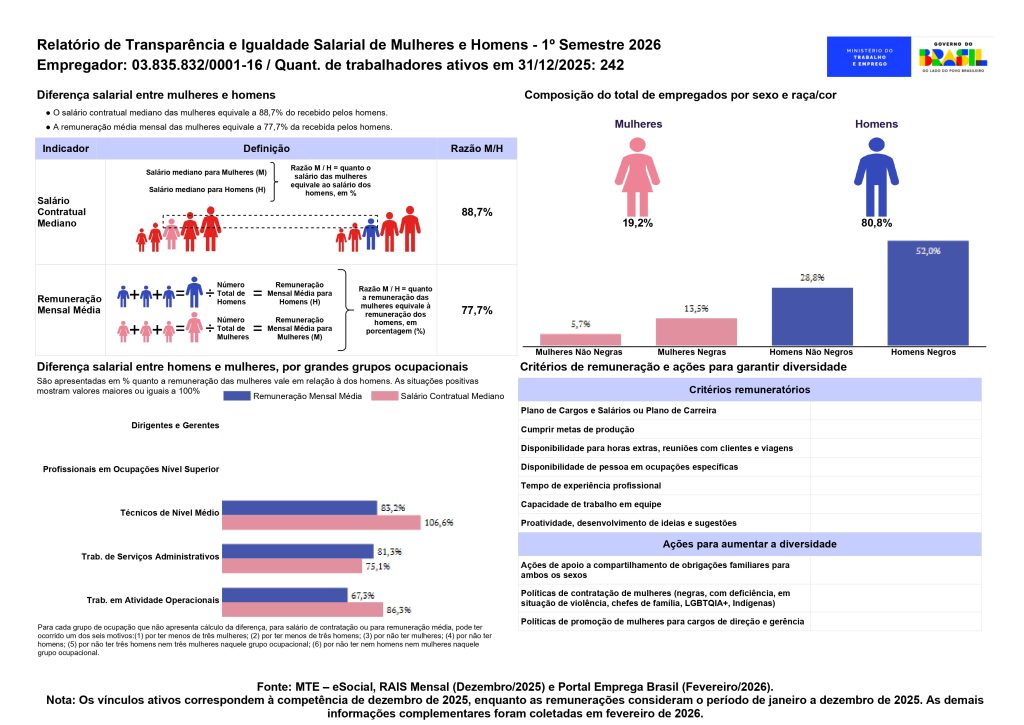 A empresa reafirma seu compromisso com a promoção da equidade salarial, da diversidade e da igualdade de oportunidades, adotando critérios remuneratórios baseados em competências, experiência profissional, desempenho e responsabilidades inerentes aos cargos.